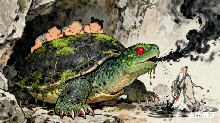 只见黑气翻腾,一只磨盘大的老鳖爬了出来,背上还驮着三个昏睡的娃。